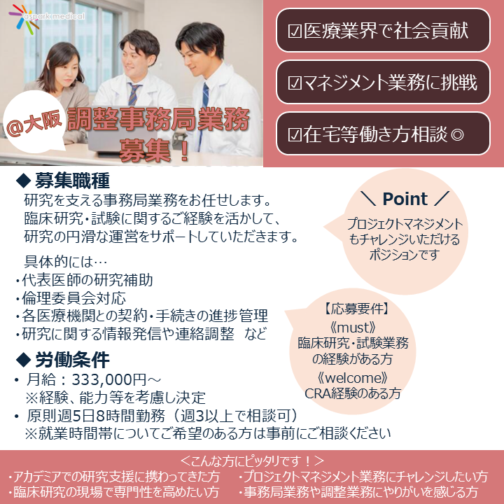 今回は、臨床研究の基盤を支える「調整事務局担当者」の募集ポジションをご紹介します。